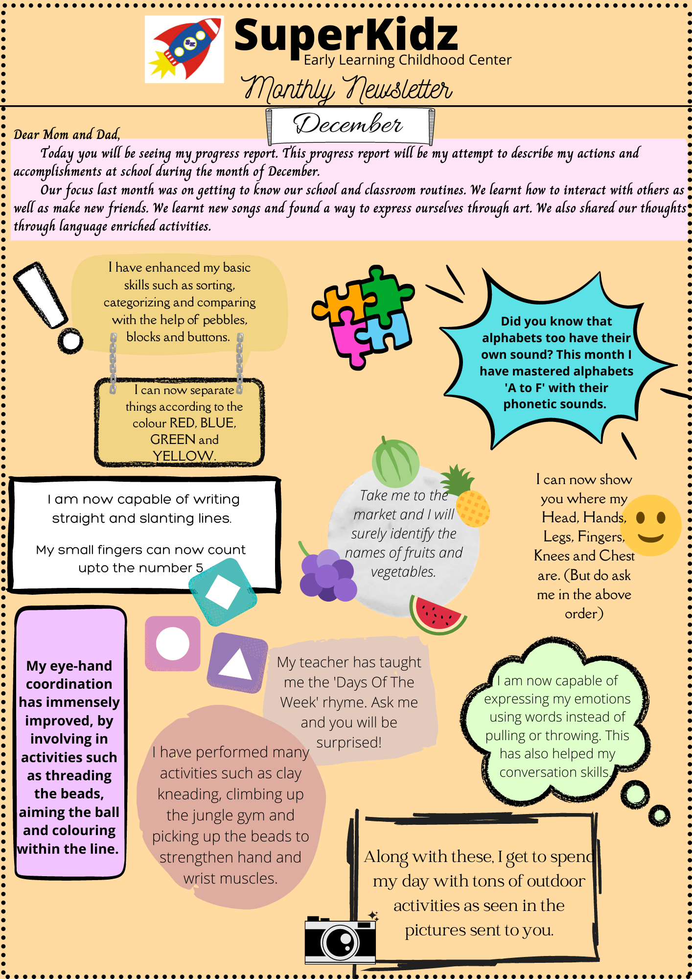 For Parents, a glimpse of a few activities and things to share are put in our Newsletters. Do Enjoy and give your feedback!